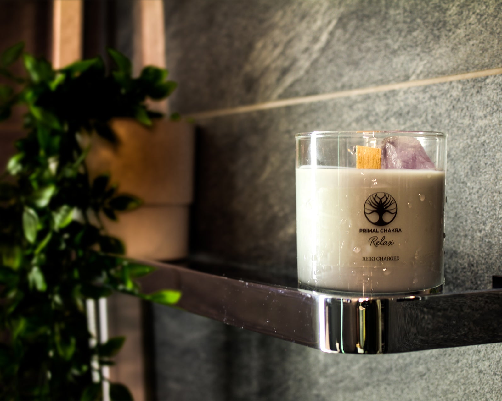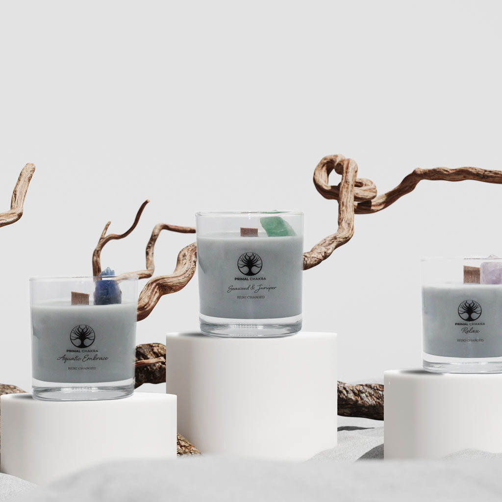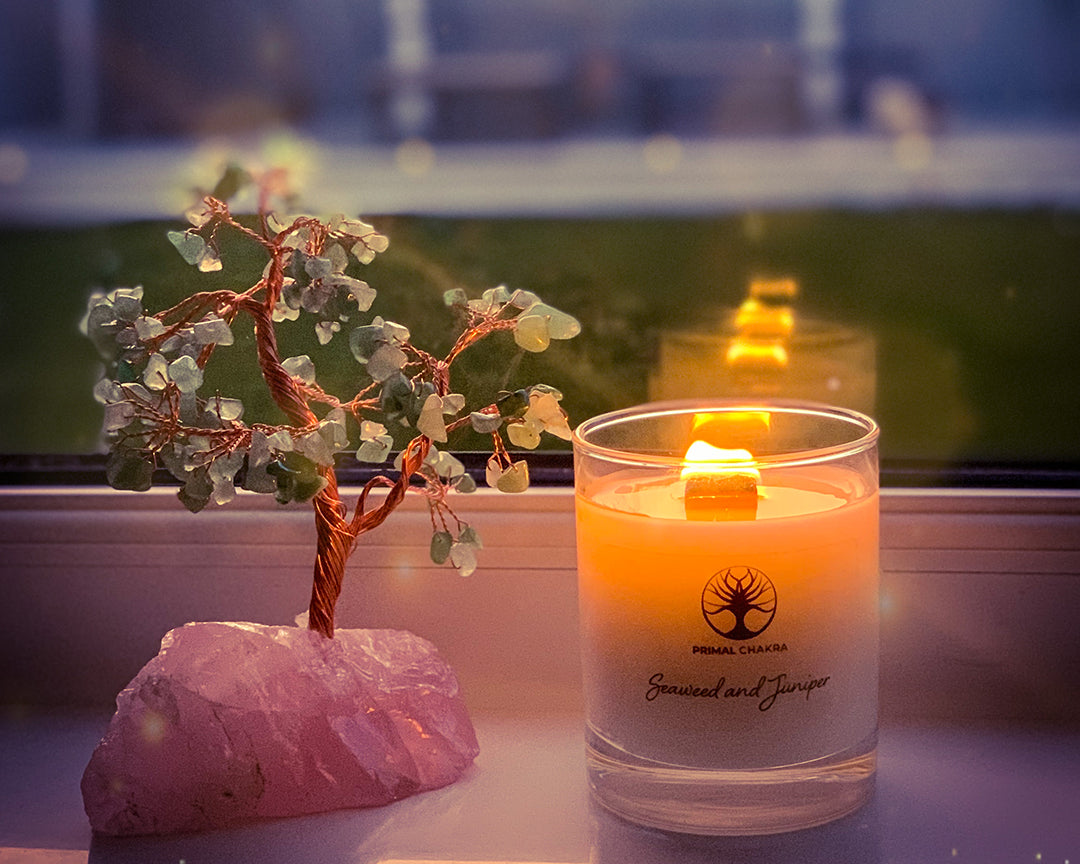 Stunning scents. Hand poured with natural soy wax. Embellished with reiki energy charged, beautiful, ethically sourced healing crystals.