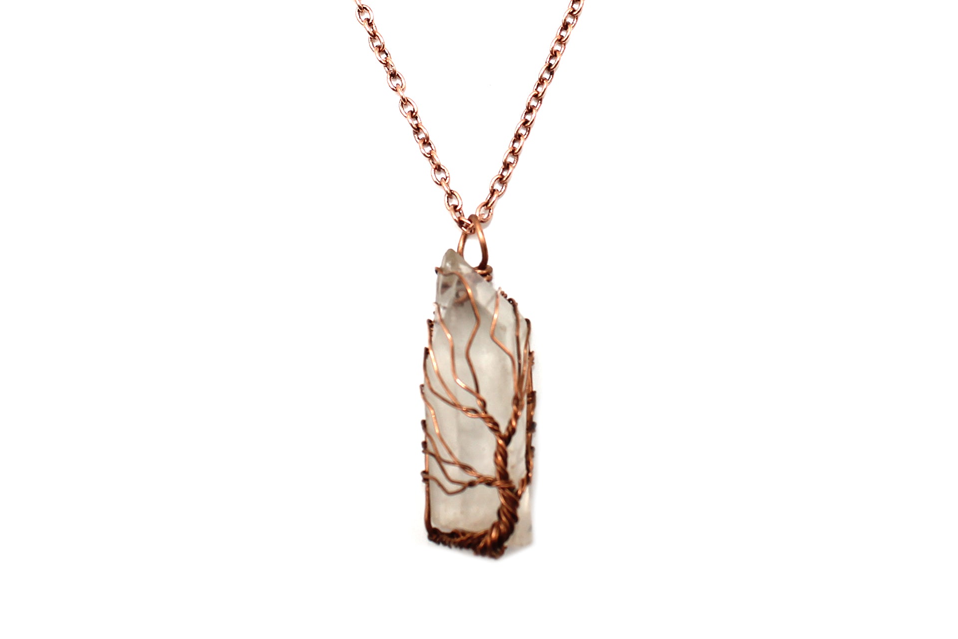 Raw Clear Quartz Crystal Tree Of Life Pendant with Golden Chain