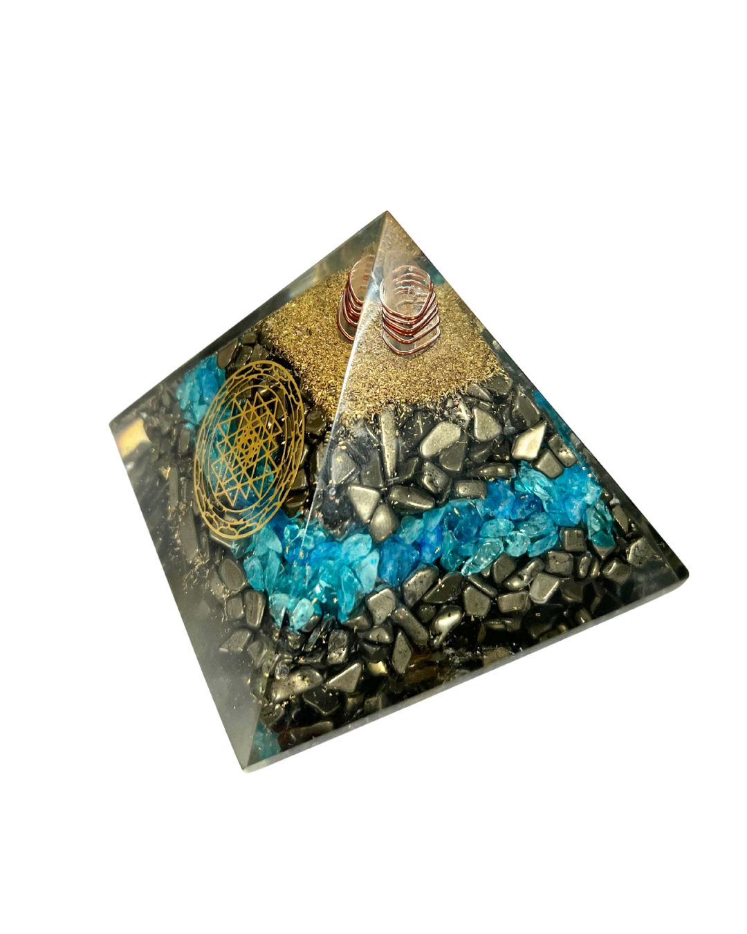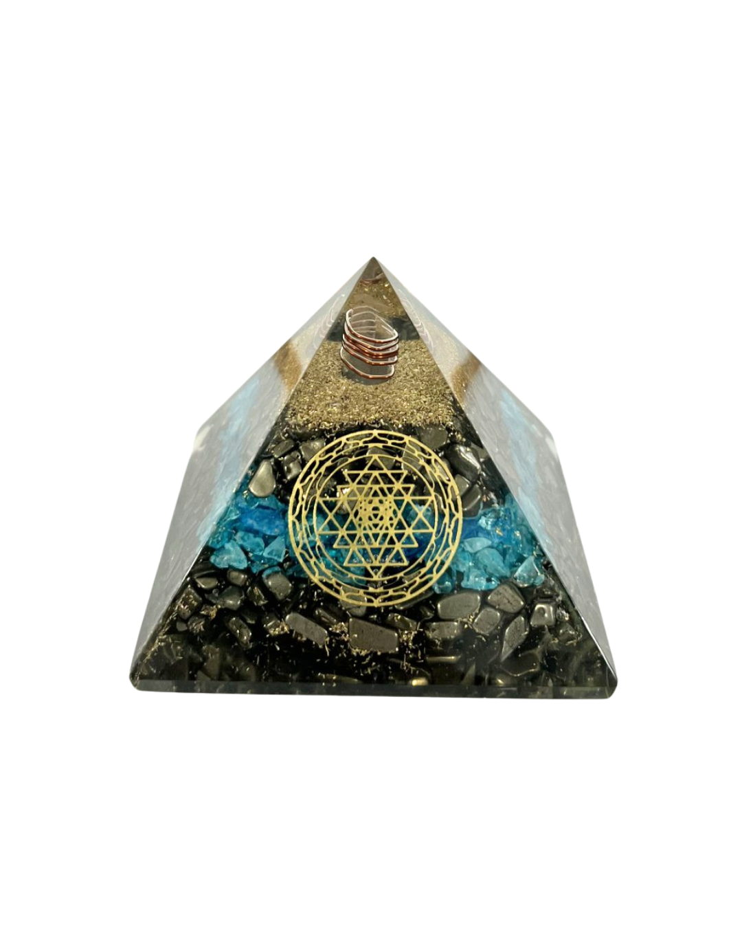 Harness the power of protection, focus, and spiritual alignment with this Layered Blue Onyx & Pyrite with Gold Reiki Energy Charged Orgone Pyramid. Infused with Reiki energy and adorned with the Sri Yantra emblem, this handcrafted pyramid is a potent tool for manifesting balance, wisdom, and personal strength.