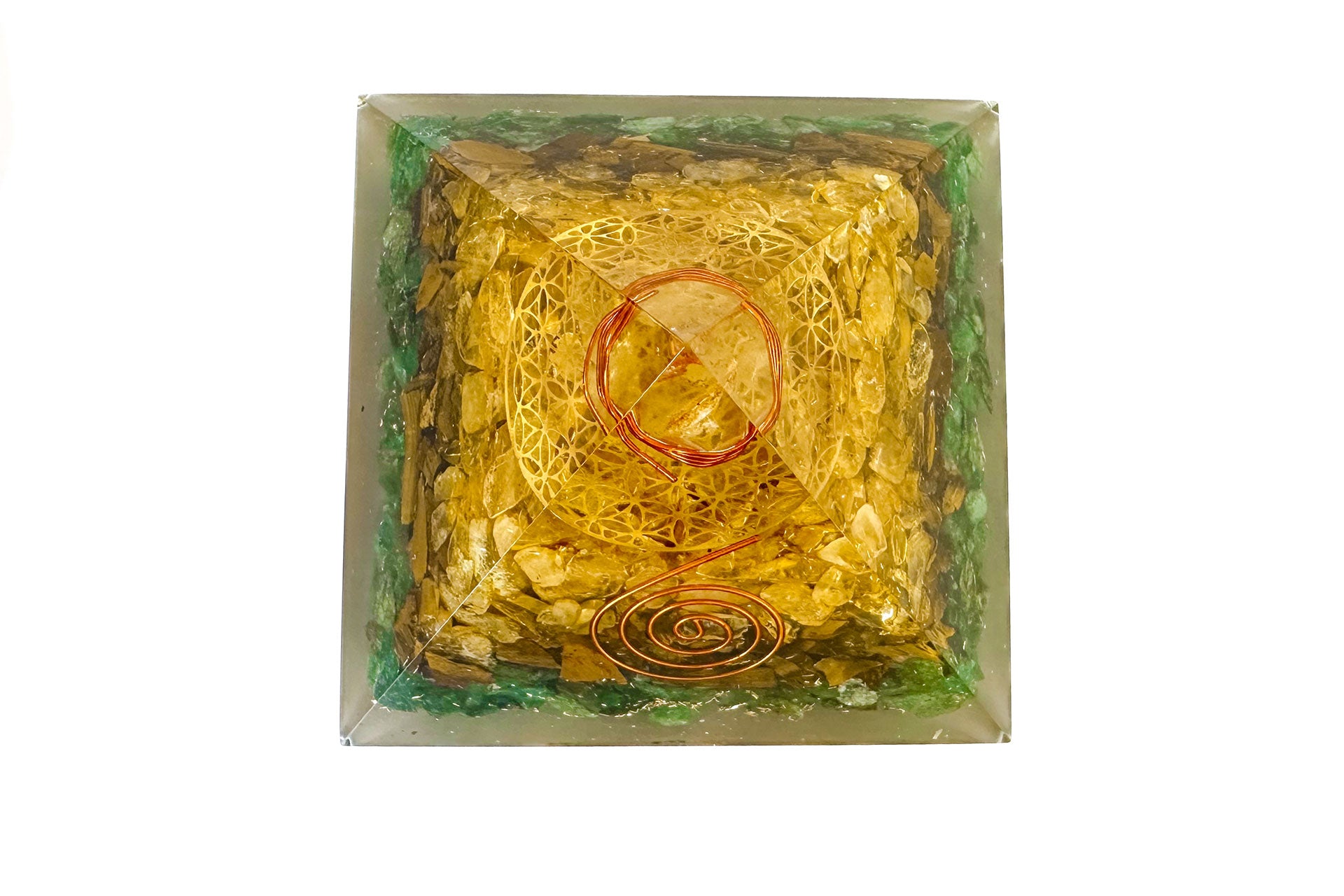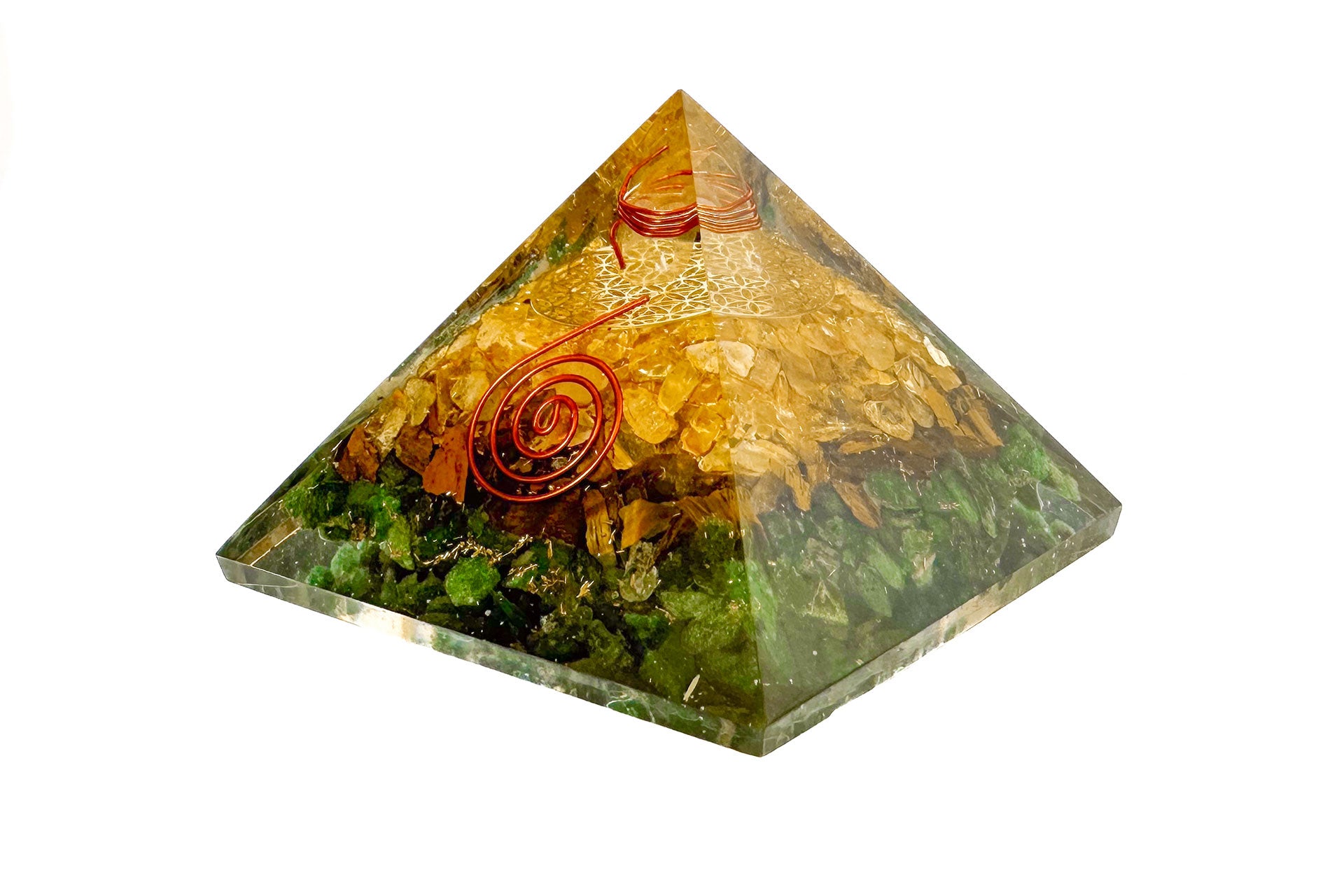 This pyramid is crafted with an orgone matrix—a blend of resin, metal, and healing crystals that work to transmute negative energy and restore balance to your environment. Infused with Reiki energy, it amplifies the properties of Green Jade, Tiger Eye, and Yellow Citrine, ensuring a continuous flow of positive, healing energy that will purify and protect your space while promoting growth and abundance.