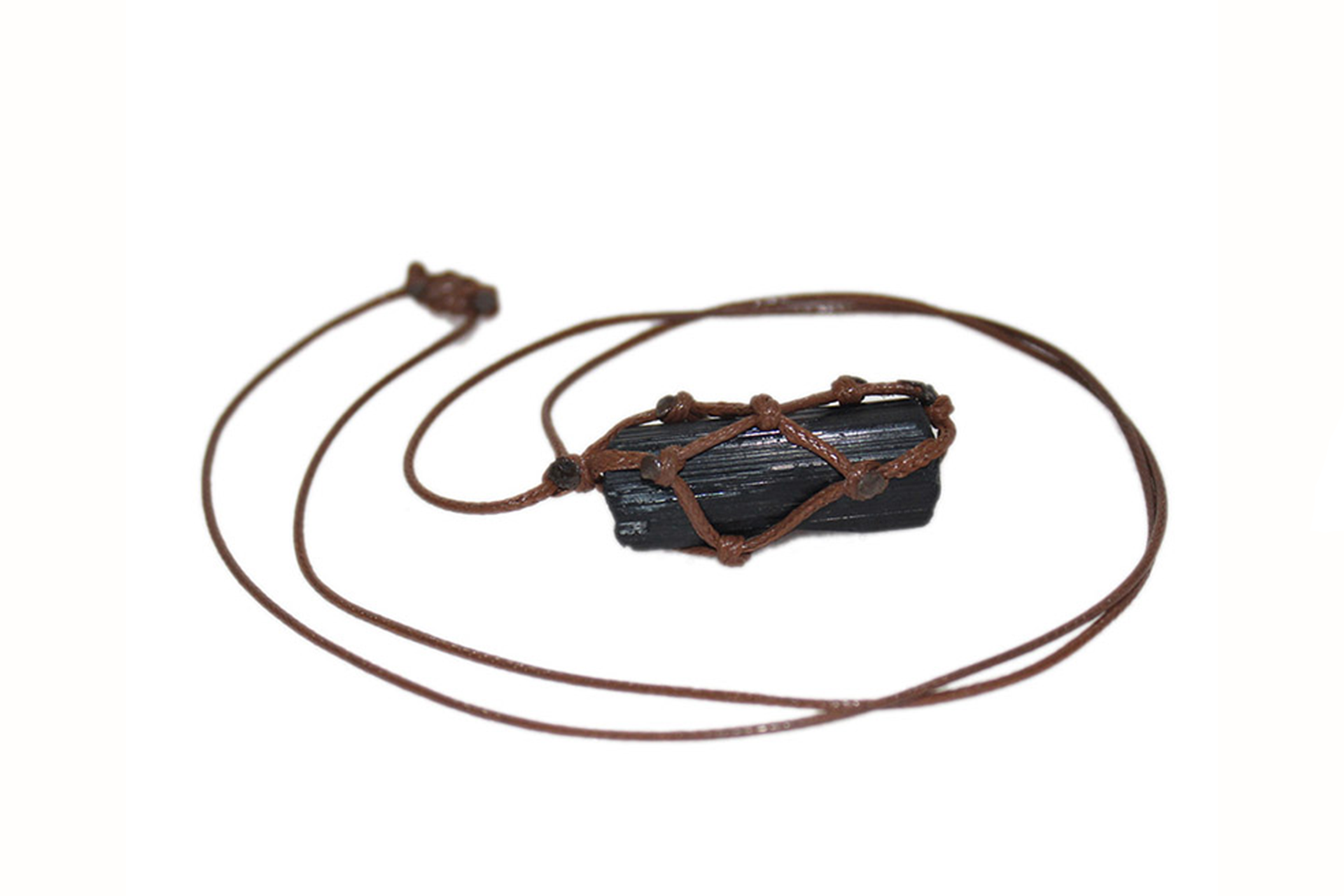 Black Tourmaline Rough Necklace with Winding Braided Brown Cord